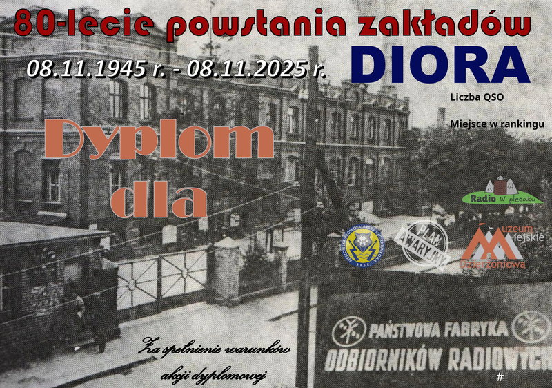 W czasie trwania akcji na pasmach będzie czynna stacja okolicznościowa SP80DIORA, która razem ze stacjami organizatora będzie przydzielała punkty do dyplomu.