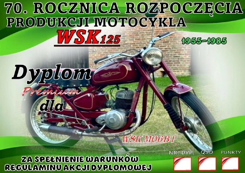 W celu upamiętnienia na falach eteru 70. rocznicy rozpoczęcia produkcji motocykla WSK 125, Grupa Polskich Krótkofalowców z Europy organizuje w dniach 18.10.2025 – 26.10.2025 akcję dyplomową.